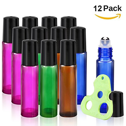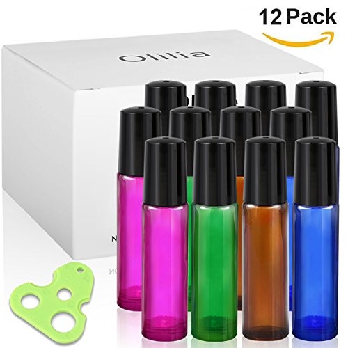 Olilia Glass Roll on Bottles with Metal Roller Balls - Essential Oils Key included 12 Pack of 10ml(1/3oz) (Mixed Color - Black Lids )