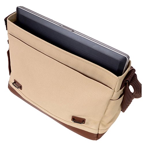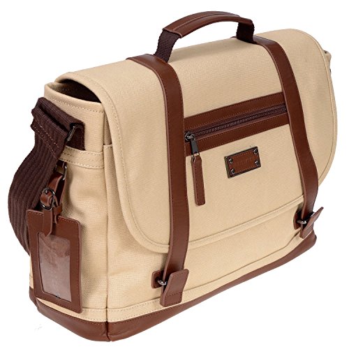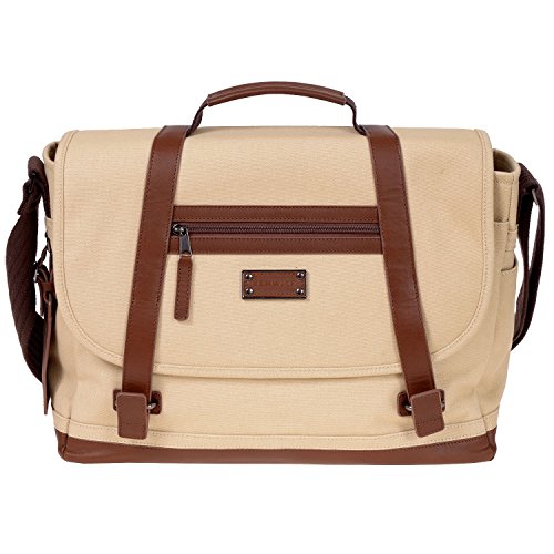 -. Title : Renwick Messenger Bag with Genuine Leather Trim, Cream Canvas