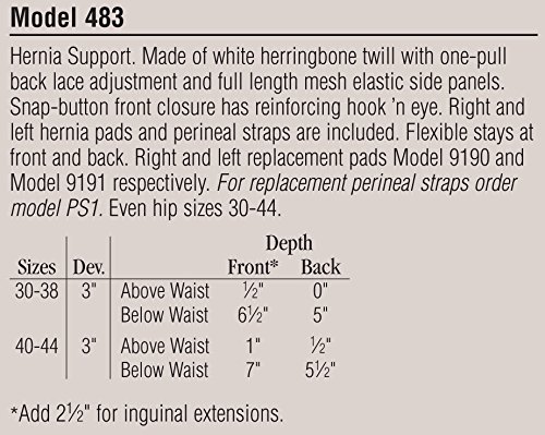 -. Feature : Men's Hernia Support / One-pull back lace -- Removable pads / Development: 3" / Front height: 7"-8" -- Back height: 5"-6" / Even hip sizes: 30, 32, 34, 36, 38, 40, 42, 44