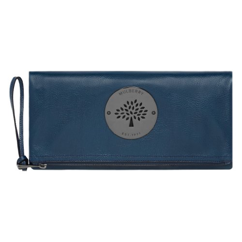 -. Feature : Spongy leather fold-over clutch / Grosgrain lining / Mulberry cut-out logo plaque on front and gold-toned hardware / Leather zip pull, zipper closure, and zip and pouch pocket under flap / Meausrements: 12" W x 6" H x 1" D