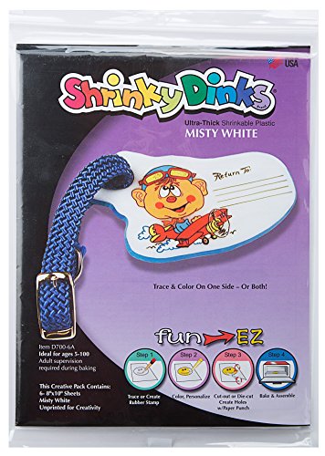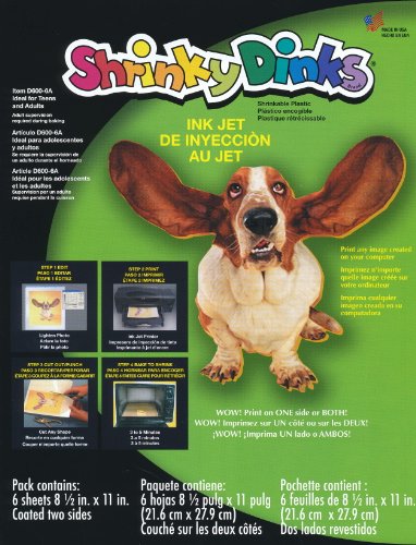 Studio : Shrinky Dinks Publisher : Shrinky Dinks Binding : Office Product Product Description NEW AND IMPROVED! This redesigned pack of Shrinky Dink Ink Jet plastic has many new features that our customers have been requesting. This SHRINKY DINKS shrinkable plastic can be run through your computers ink jet or bubble jet printer. Choose any photo, lighten it by at least 50% and run the sheet of plastic through your printer to produce the image of your choice. You can create any number of wonderfully creative projects using your photos, computer graphics, or your own artwork. Choose pictures from your digital camera or scan in pictures from your photo albums. These new white sheets are larger, 8 1/2 x 11 inches so that printer adjustments are no longer necessary. Our improved sheets are also water resistant, so that sealing is no longer necessary. Even more exciting is that the newest version of Shrinky Dinks for Ink Jet printers is designed to be printed on BOTH sides. Yes!! You can now print your image on one or both sides for added creativity. We think you will find our new and improved Shrinky Dinks Ink Jet sheets even more fun than ever. Each pack contains 6 sheets . Complete instructions are contained in every package of plastic. Recommended printers HP, Lexmark, Canon. Ages 13 0