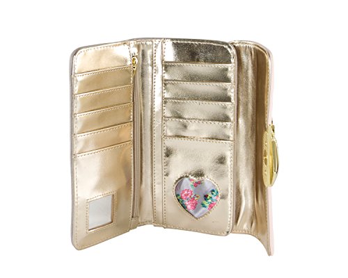 For the perfect blend of fashion and function, get the stylish Betsey Johnson Flapover Wallet. Its constructed of quilted pvc leather and finished with Betsey heart The wallet features a 8 Credit Card Slots, 2 Bill slots, Id Window, mirror and Coin pocket, It's compact yet perfect for keeping your stuff organized!!