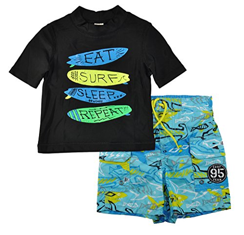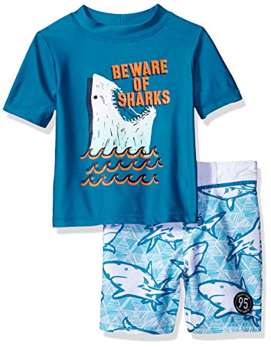 Short sleeve rash guard top with beware of sharks phrase and shark print shorts