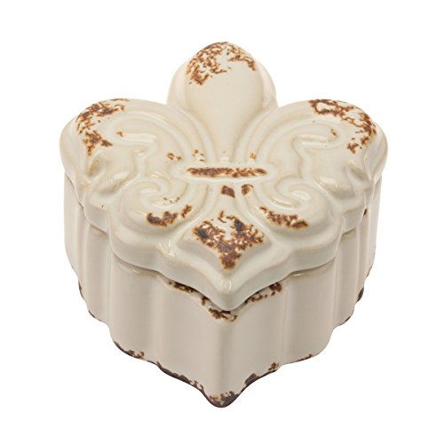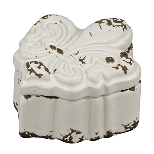 Stonebriar Small Worn White Ceramic Fleur De Lis Jewelry Box, Decorative Keepsake Trinket Boxes, Unique Gift Idea for Birthdays, Weddings, Engagements, Christmas, or Any Special Occasion