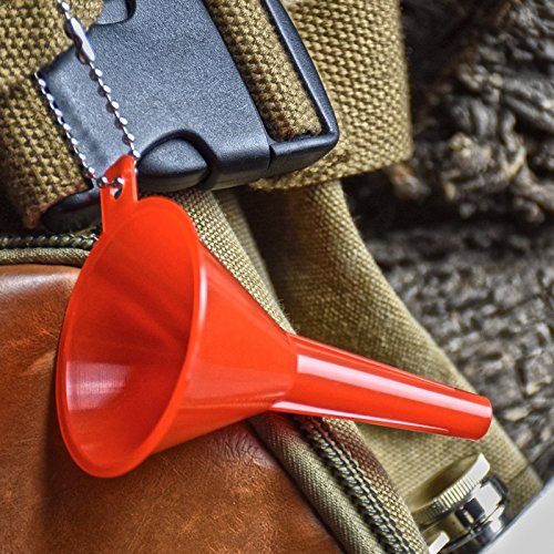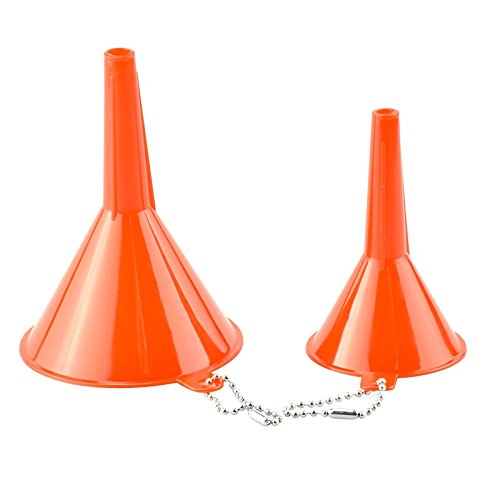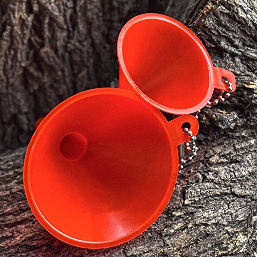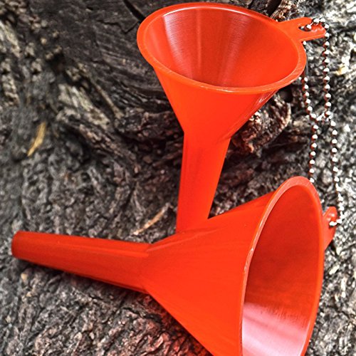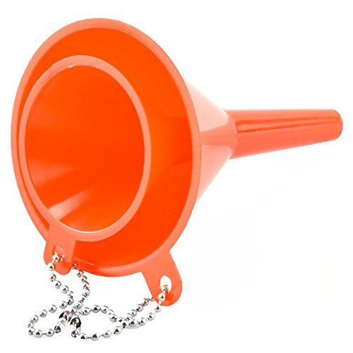 -. Feature : Material: Durable, Lightweight Polypropelene / Mini Handle w/ Hole for Key Chain | Detachable Ball Chain / Larger Funnel Dimensions: 4" x 2.75" (Top Diameter) / Smaller Funnel Dimensions: 3.25: x 2" / Bright Orange Color