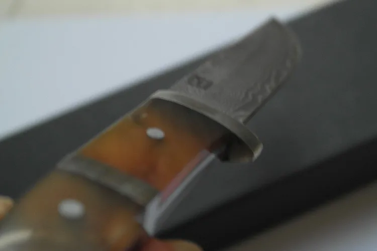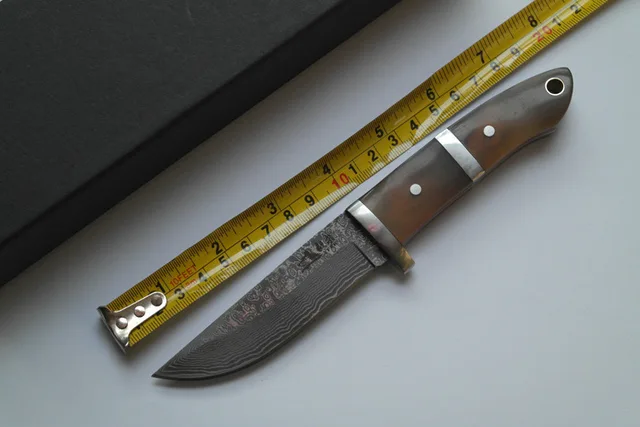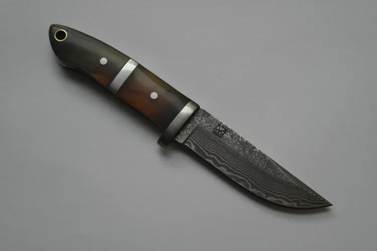 | [해외] 최고 품질 다마스커스 스테인레스 스틸 스트레이트 나이프 야외 전술 사냥 칼 Ox 경적 핸들 진짜 가죽 칼집 |