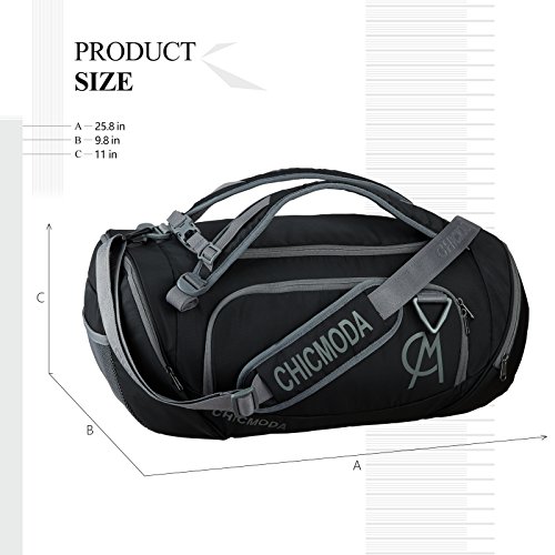 -. Binding : Misc. -. Brand : CHICMODA -. Department : unisex-adult -. Feature : Weather protection - Weather-resistant material deflects water and dirt to help protect stored items during tough outdoor workouts or tough daily commutes / Versatile Storage - Large vented pocket for laundry or shoes, additional large zippered pocket & one mesh pocket / Organized Storage - Multiple compartments help keep your gear secure and organized / An adjustable clip and padded strap allow you to carry the bag over your shoulder or behind your back, so it stays out of the way when you're on the move. / Product details - Dimensions: 25.8" x 9.8" x 11" , Materials: Super-durable 150 denier, Cubic Volume: 32L -. Label : CHICMODA -. Manufacturer : CHICMODA -. PackageQuantity : 1 -. ProductGroup : Sports -. ProductTypeName : SPORTING_GOODS -. Publisher : CHICMODA -. Studio : CHICMODA -. Title : CHICMODA Travel Duffel Backpack Lage Gym Sports Bag with Shoe Compartment