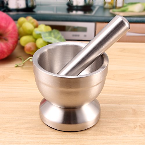 -. Feature : Brushed Finish Modern Design. / Sleek stainless steel mortar & Pestle. / Ideal for grinding fresh herbs and spices. / Perfect tool used to crush, grind and mix substances. / L: 10.5 x 10cm (Dia*H); S: 8.5 x 9cm (Dia*H)
