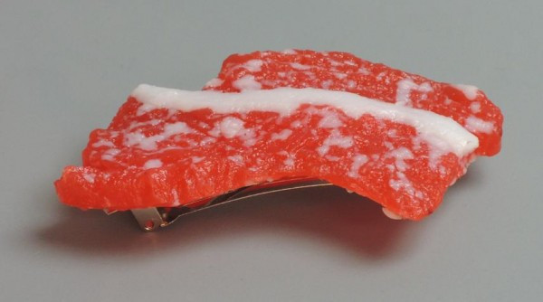 食品サンプルの生肉がくっついたバレッタです。磁石付きの食品サンプルだからバレッタの色んなところにくっつけたり、角度変えることができます。強めの磁石なので簡単には外れません。
