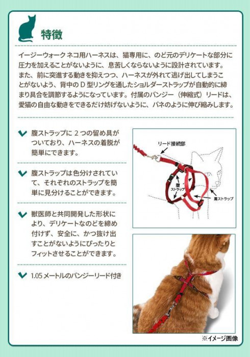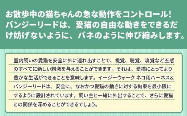 動きやすさと安全を考えた、ハーネスとバンジーリードのセットです。愛猫の喉を締め付けず、安全に、かつ抜け出すことがないようにぴったりフィットさせることができます。ワンタッチバックルでハーネスの着脱も簡単。バンジーリードの長さは約1mで、リード部分が伸び縮みするので、動きやすく快適に装着いただけます。胴回りが約27~36cmのネコちゃん用。 |