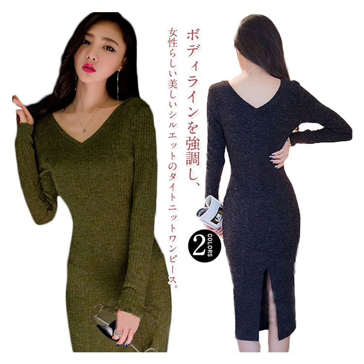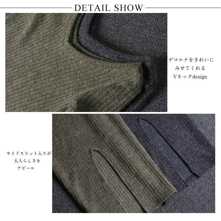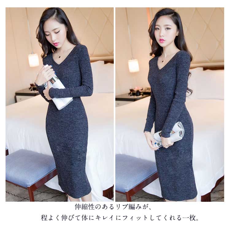 | ボディラインを強調し、女性らしい美しいシルエットのタイトニットワンピース。前後とも深めのVネックラインでデコルテをきれいに見せてくれます。伸縮性のあるリブ編みが、程よく伸びて体にキレイにフィットしてくれる一枚。普段着だけでなく、華やかな小物を足すことで、パーティーや二次会などにも使えます! | |