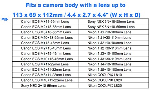 Fits camera with a lens up to 113 x 69 x 112mm / 4.4 x 2.7 x 4.4" (W x H x D). This series camera pouches are mainly suitable for Mirrorless Cameras and Advanced Zoom Compact Cameras