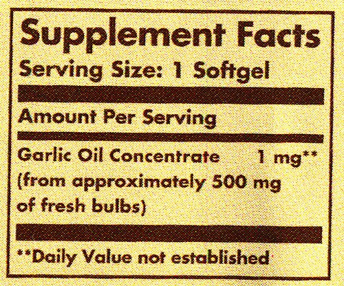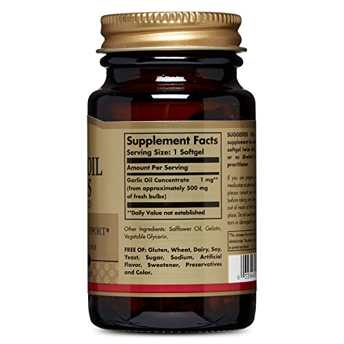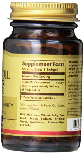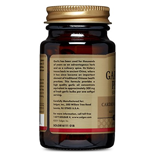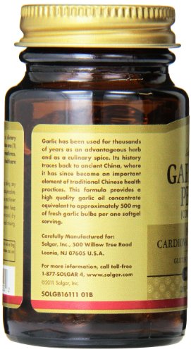 ReleaseDate : 2013-09-28 Studio : Solgar Publisher : Solgar Binding : Health and Beauty Product Description This formula provides a high quality garlic oil concentrate equivalent to approximately 500 mg of fresh garlic bulbs per one softgel serving natural cardiovascular support. Sugar, starch and salt free. Suitable for vegetarians. 0