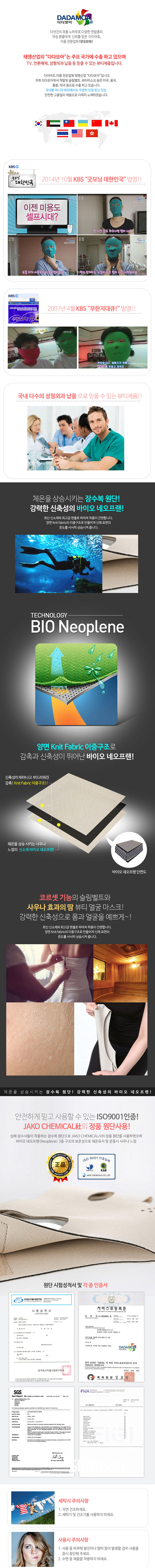 Delivery of many plastic surgeons in Korea Covered by several Korean broadcasters Reliable ISO9001 certification JAKO CHEMICAL's genuine fabric Wet Suit Fabricating Body Temperature Strong stretch: BIO Neoplene It is made of double-sided structure to gradually increase the temperature of the surface of the body.