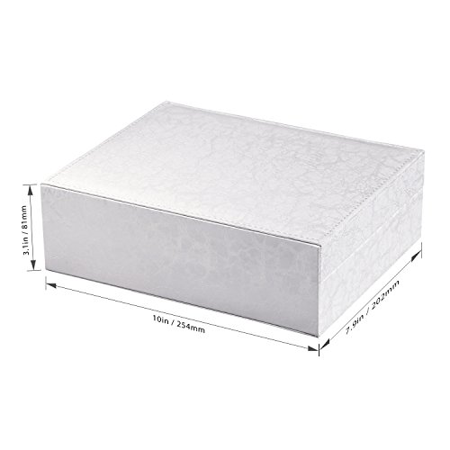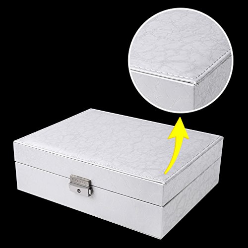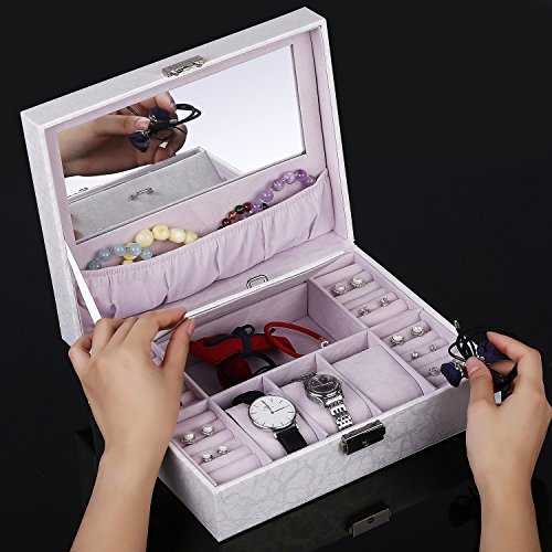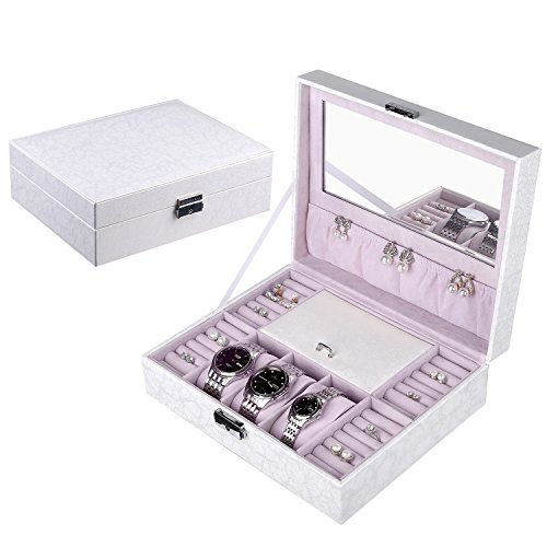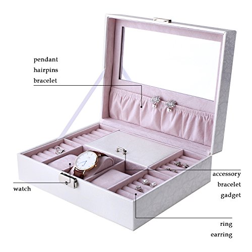-. Feature : ❤ well-made workmanship: Top quality and stunning well made it is, the whole outside of jewelry box is a pearl white PU leather and it has stitching detail around the edges. The interior is fairly light pink velvet to protect against scratch. / ❤ functional and sophisticated: In the top, there is a good sized mirror and an elastic pouch for storing loose pendants, charms or clip on earrings etc. The bottom is set out with left and right sides having 4 sections with 6 individual areas in each for storing of rings, earrings, flat pendants etc. With the middle area having a boxed area for loose items and three handy velvet covered pads for holding watches or bracelets. / ❤ fashionable and exquisite: This jewelry box is usually either a child like design or old fashion. It also has a suitable size which is not so small of too big. The whole exterior box is a lovely leather look with a touch of gold shimmer when the light hits it which is simply exquisite and gorgeous. / ❤ security to use: With a mini stainless steel lock and key for security, you can simply pushed in either side of the lock and pull up the top. The lock is stylish and give a very posh look. It can be also prevent your kids to open the box. / ❤ convenient and practical: There is a nice sized mirror grace the lovely box to help you check your jewelry looks on you. It is handy if you take the jewelry box on. There is a pocket underneath the mirror for more storage.
