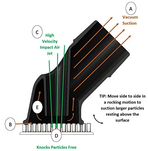 Are you tired of leaving behind debris because it is stuck in narrow cracks? Well, this ergonomically designed nozzle will help you clean surfaces like never before. It allows minor suction to occur around the unit, which picks up surface particles. What sets this nozzle apart is it ram air jet funnel, which sends a high velocity air stream down into the narrowest of cracks. The loose debris is then pulled in by the vacuum's suction. The result is a highly efficient means to clean just about any surface. It works great on automotive fabrics as well as in the shop, cleaning within cracks or on textured mats.