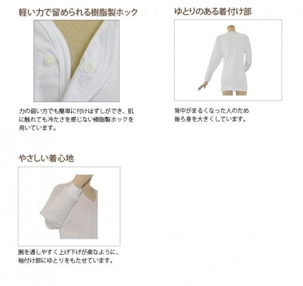 吸収性に優れ、肌触りのよい綿素材を用いた厚手の肌着です。取りはずしが楽に行えるホックを採用しています。