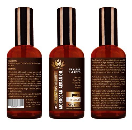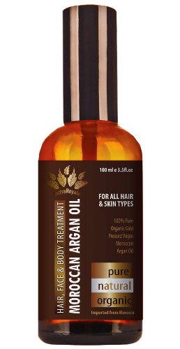 "NutraRoyale 100% Pure Organic Virgin Moroccan Argan Oil is derived from the Argania Spinosa tree - a rare endangered and protected tree, native only to the deserts of Morocco. It is rich in Vitamin E tocopherols and tocotrienols, Omega 3, 6, and 9 Essential Fatty Acids, Proteins, and in many of the B Vitamins, including Folic Acid. This abundance of nutrients causes it to retain all its moisture and thrive in the sizzling desert heat. The many benefits of our NutraRoyale "liquid gold" Argan Oil includes being very easily absorbed into the hair, skin, and nails. It hydrates, detangles, and revitalizes hair, making it soft, manageable, and silky smooth, with no frizz and no greasy feel. It leaves hair lustrous, shiny, healthy, and smelling great. Our Argan Oil's wealth of antioxidants fights free radicals which damage skin. It provides multiple anti-aging benefits and removes wrinkles and fine lines on your face. NutraRoyale Moroccan Argan Oil is used as a moisturizer for the entire body, including dry hands, feet, heels, lips, nails and cuticles. It also has powerful healing and protective properties that may soothe and diminish scars from acne, stretchmarks, psoriasis, rosacea, and sunburn. Own your bottle of argan oil now and start to experience the NutraRoyale advantage"Feature