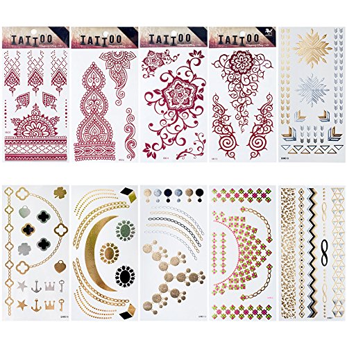 Linda Diary 10 Sheet Set Temporary Body Art Tattoos - Metallic tattoo, Henna pattern