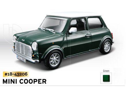 -. Binding : Toy -. Brand : Die Cast Models -. EAN : 4893993432066 -. Feature : Mini Cooper in green with white roof 1/32 scale / Opening front & passenger doors, working wheels, black interior, detailed interior & exterior. / Model is mounted on a removable plinth with a removable hard plastic cover. / Make: Bburago (Street Classics) / Scale: 1/32 -. Label : Bburago -. Manufacturer : Bburago -. Model : 18-43206 -. MPN : 18-43206 -. NumberOfItems : 1 -. PackageQuantity : 1 -. PartNumber : 18-43206 -. ProductGroup : Toy -. ProductTypeName : TOYS_AND_GAMES -. Publisher : Bburago -. Studio : Bburago -. Title : Bburago Mini Cooper 1:32 Scale Diecast Car Model Street Classics