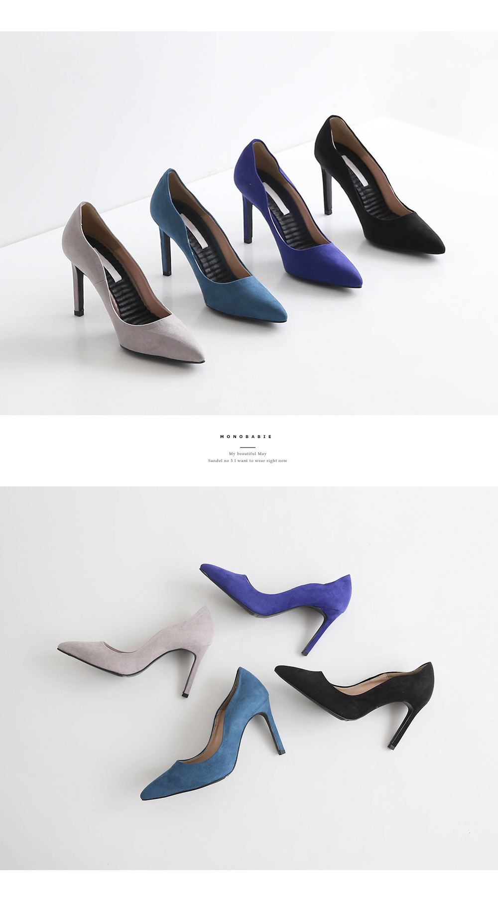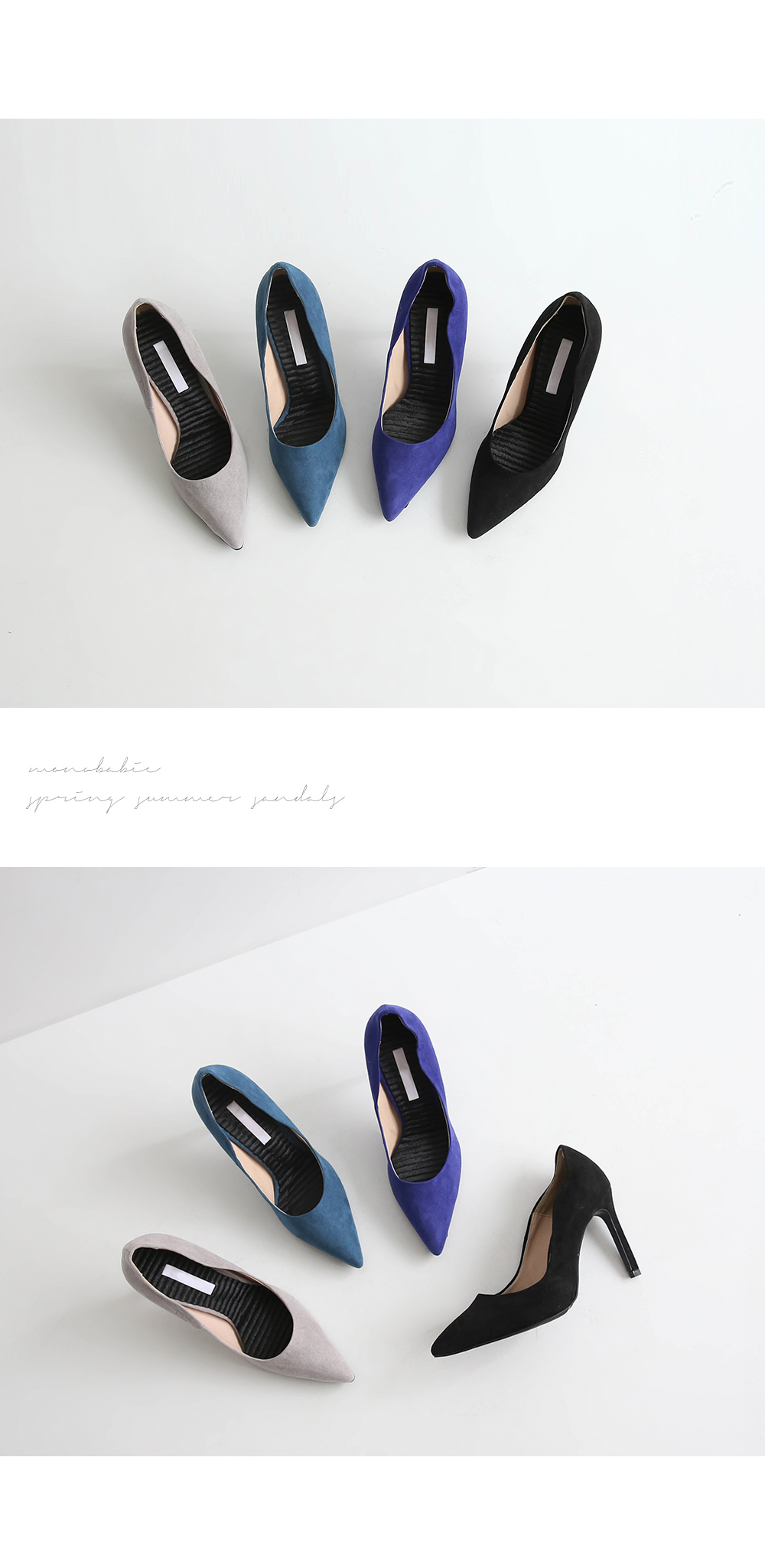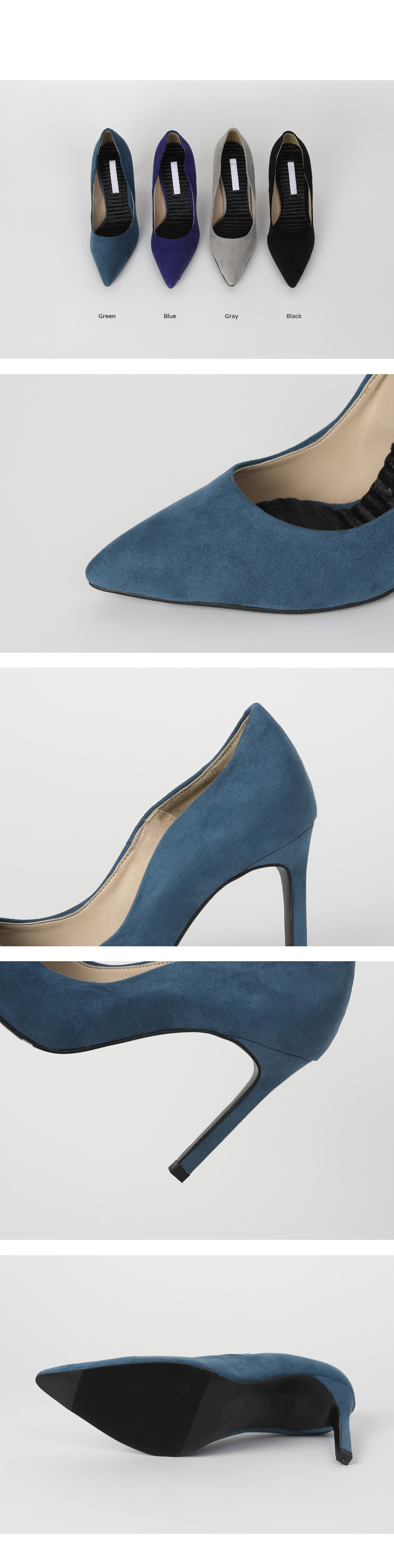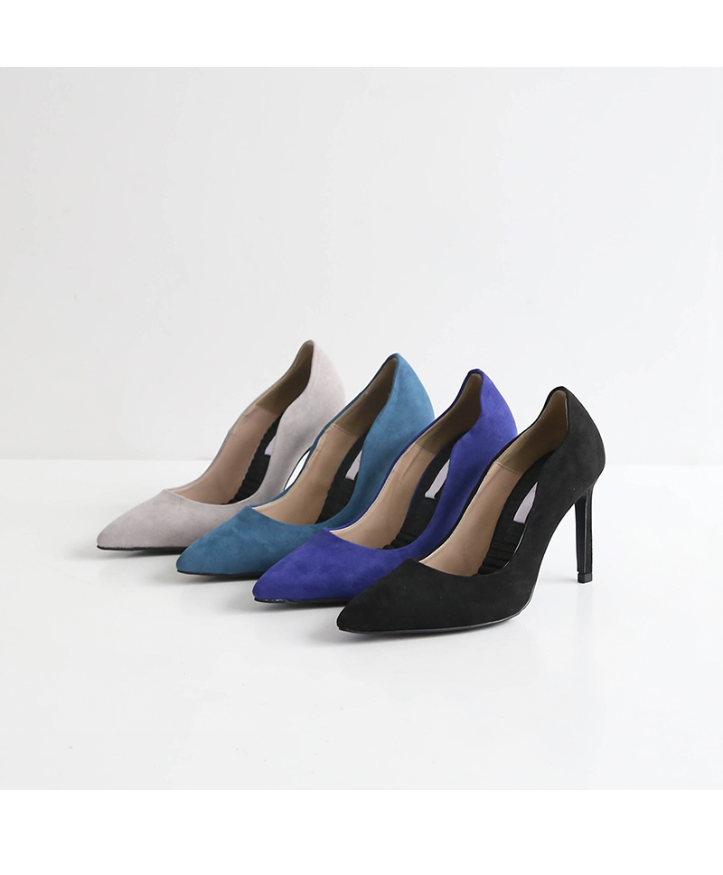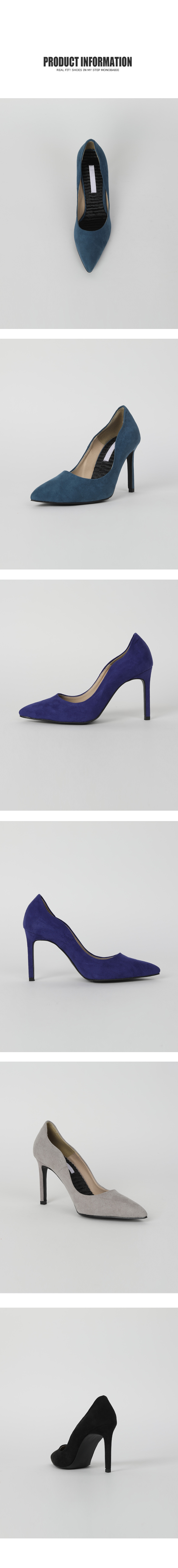 인조스웨이드의 깔끔한 웨이브 쉐입의 터치라인과 슬림한 바디라인이 만나는 하이힐 펌프스입니다.