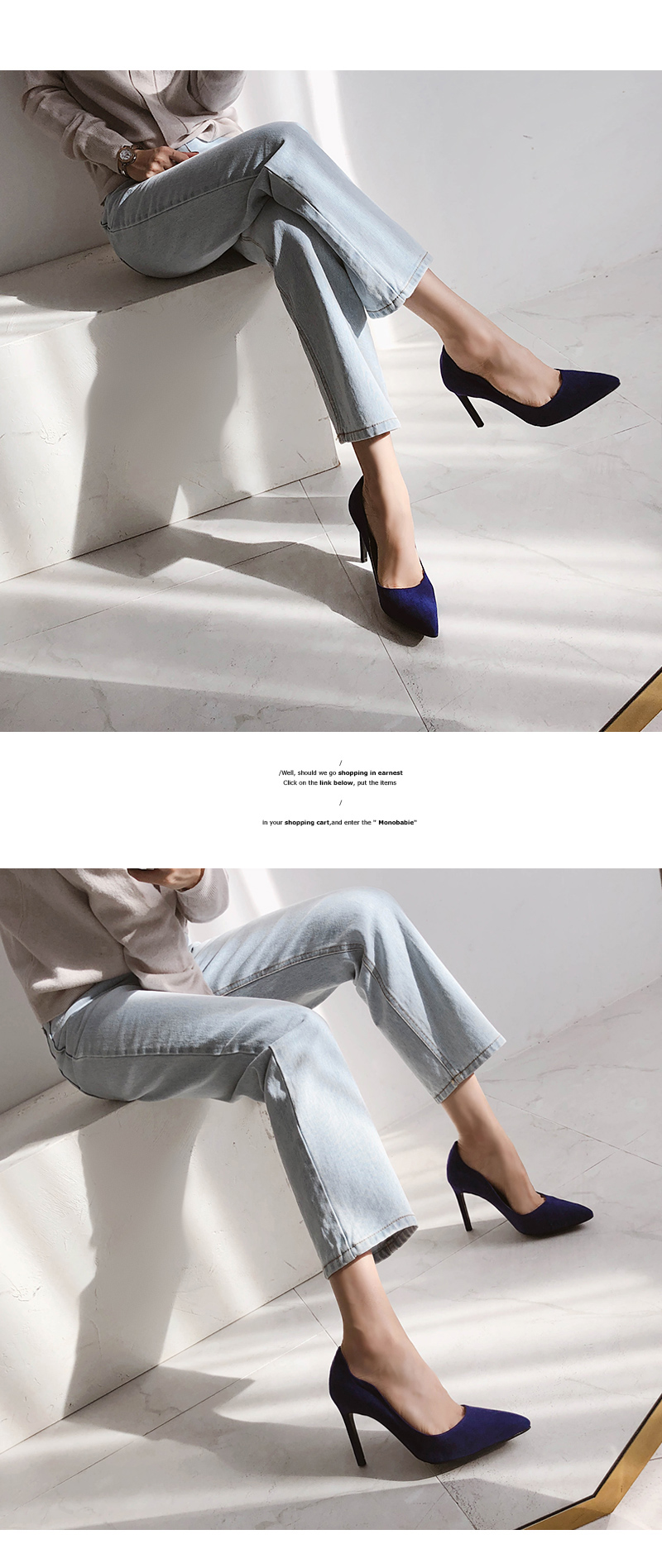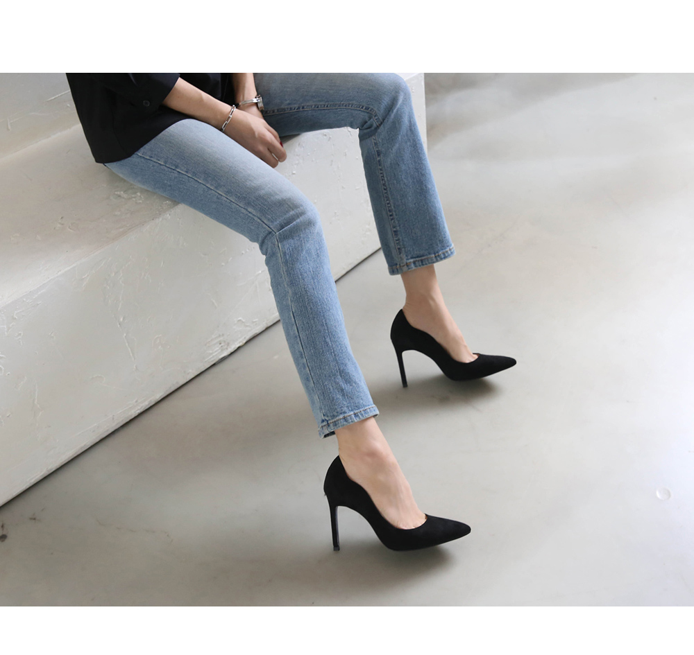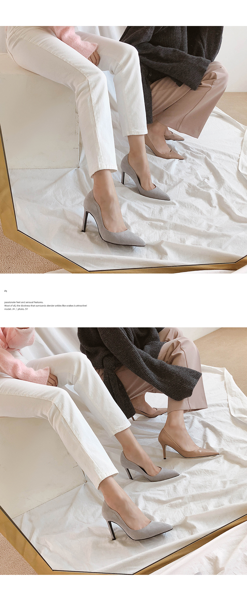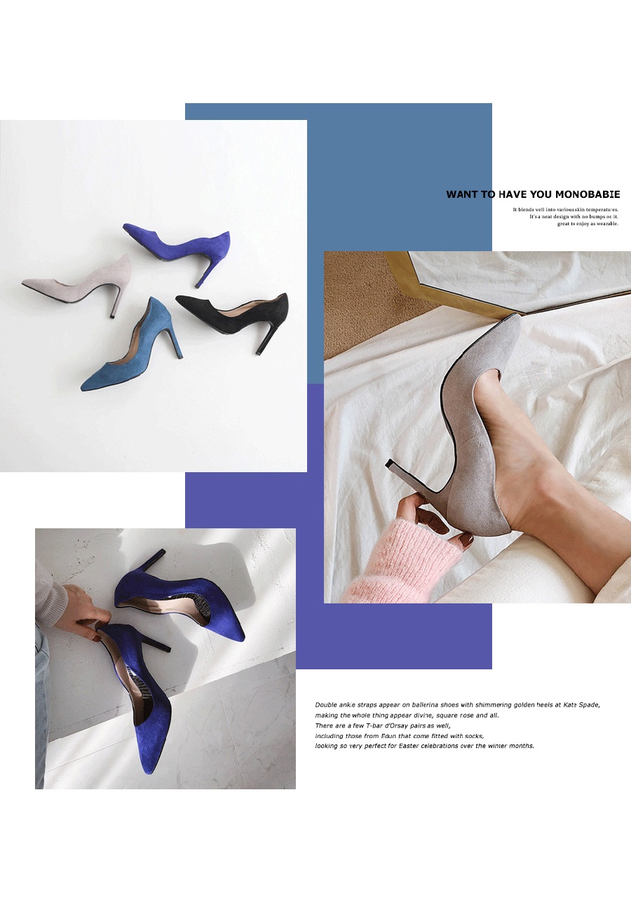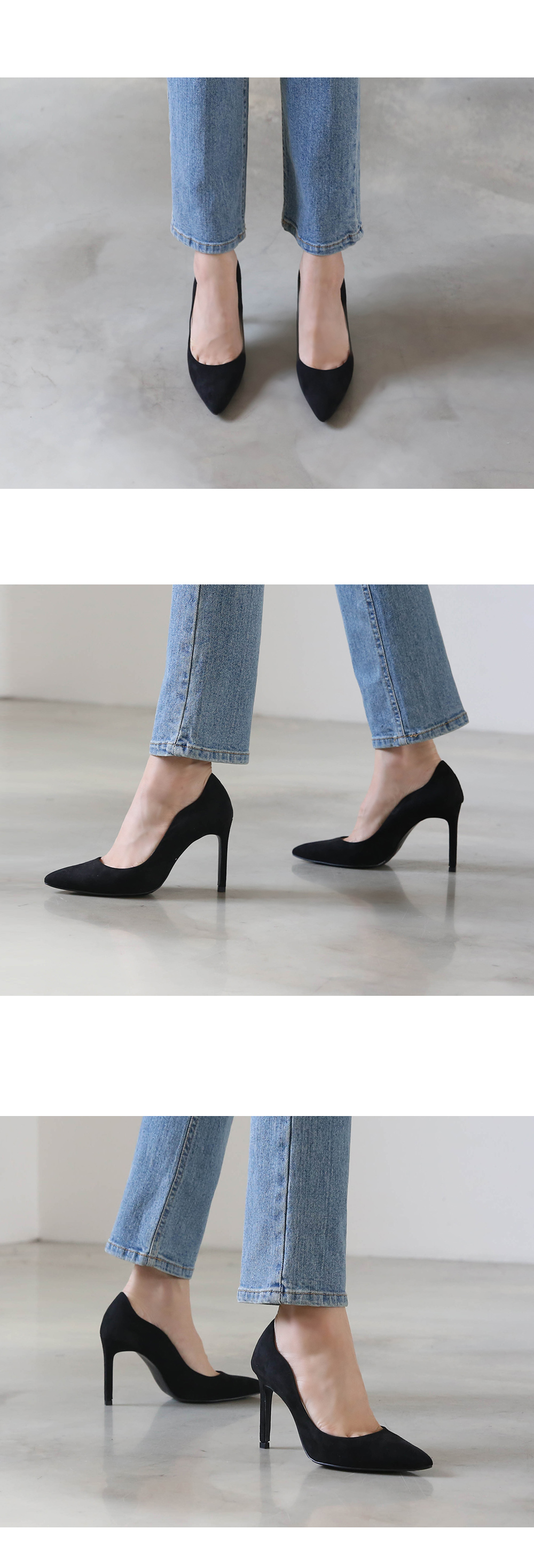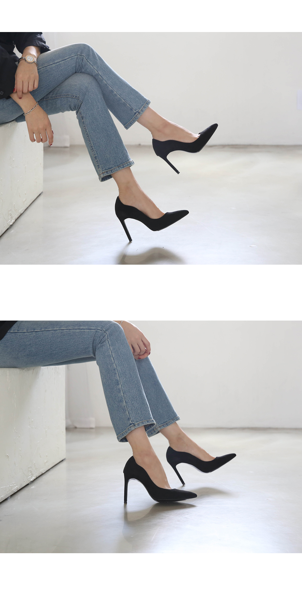 인조스웨이드의 깔끔한 웨이브 쉐입의 터치라인과 슬림한 바디라인이 만나는 하이힐 펌프스입니다.