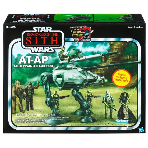 -. Binding : Toy -. Brand : Star Wars -. EAN : 0653569750062 -. Feature : The Star Wars Vintage Class II Attack Vehicles Wave 01: Episode III AT-AP features a cannon which rotates 360 degrees and articulated legs; the middle leg swings up to reveal a hatch which accommodates up to three 3.75" figures. / A relative of the AT-PT, the All Terrain Attack Pod is a troop-supporting assault vehicle with two P.R.Imary legs and a third carried beneath the fuselage for instances in which greater stability is required. / Armed with a forward projectile cannon and a fuselage-mounted blaster cannon, the AT-AP was briefly shown among the Clone Trooper infantry during the Battle of Kashyyyk. -. IsAdultProduct : 0 -. Label : Star Wars -. Manufacturer : Star Wars -. Model : 38884 -. MPN : 38884 -. PackageQuantity : 1 -. PartNumber : 38884 -. ProductGroup : Toy -. ProductTypeName : TOYS_AND_GAMES -. Publisher : Star Wars -. ReleaseDate : 2012-01-30 -. Studio : Star Wars -. Title : STAR WARS Vintage Class II Attack Vehicles- Episode III AT-AP -. UPC : 653569704386 -. Warranty : 1 year warranty against manufacturer defects