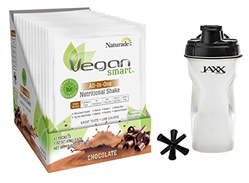 Naturade VeganSmart All-In-One Nutritional Shake Chocolate Single Servings x 12 in Bundle with Jaxx Shaker Black 28 oz. All-In-One Nutritional Shake for Optimal Health* Everything you need in just one serving. VeganSmart is also a delicious, nutrient-supplementing addition to your favorite smoothie recipe - just blend and enjoy! Take one, or more servings daily for optimal health.* NO ACESULFAME K, NO ARTIFICIAL SWEETENERS, NO ARTIFICIAL FLAVORS, COLORS, OR PRESERVATIVES, NO MSG, NO SOY, GLUTEN FREE, NO EGG, NO DAIRY, NO YEAST, NUT FREE.Feature