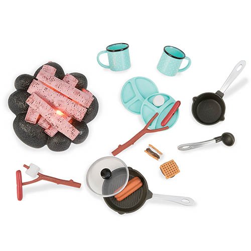 -. Feature : Includes: campfire with flickering lights (3xAA batteries included), roasting sticks with hot dogs and marshmallows, sausages, s'mores, camping dishes and mugs, pot, frying pan with lid and ladle / For 18 inch (46cm) dolls of all brands / Doll not included
