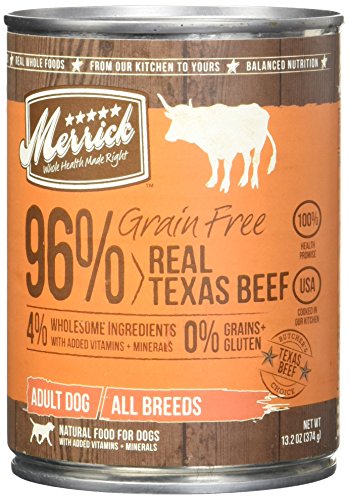 -. Binding : Misc. -. Brand : Merrick -. Department : Food -. EAN : 0622013217123 -. Feature : Complete & balanced nutrition for your dog / Grain-free, all natural formula / Fresh meat is the #1 ingredient / Made in the US and contains no artificial colors, flavors, preservatives or by-products / Ideal for both puppies & adults -. Label : Merrick Pet Foods -. Manufacturer : Merrick Pet Foods -. Model : 022808204862 -. MPN : 022808204862 -. NumberOfItems : 1 -. PackageQuantity : 12 -. PartNumber : 022808204862 -. ProductGroup : Pet Products -. ProductTypeName : PET_SUPPLIES -. Publisher : Merrick Pet Foods -. Size : 13.2 oz. -. Studio : Merrick Pet Foods -. Title : Merrick Grain Free Real Beef (Pack of 12) -. UPC : 022808204862