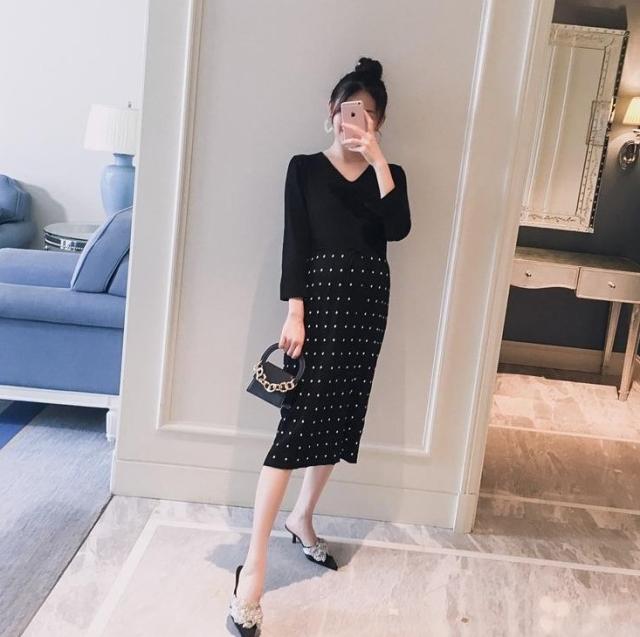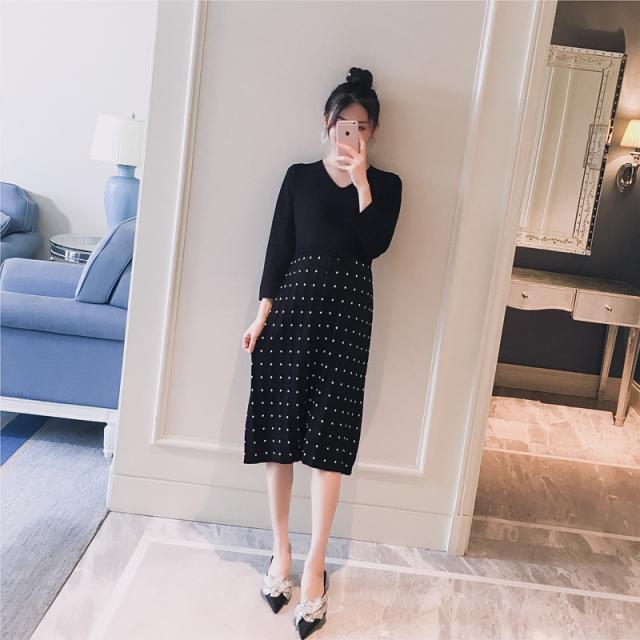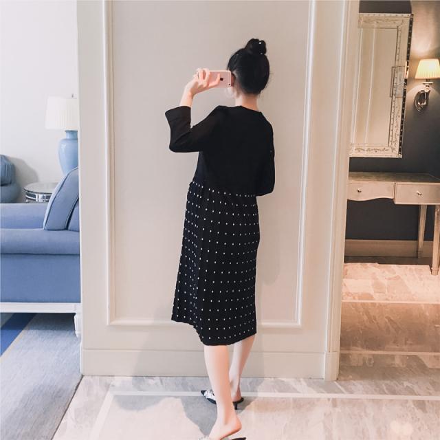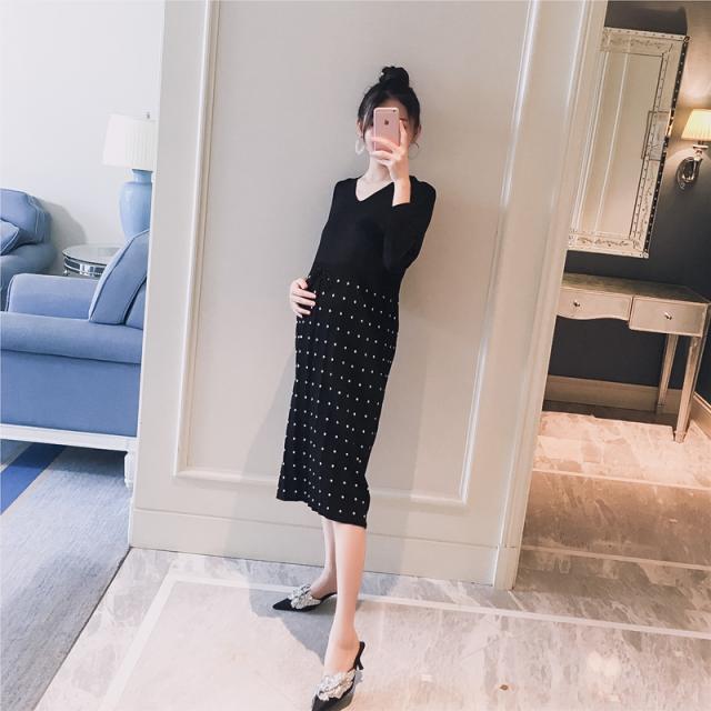 プリーツ ドット柄 ワンピース ニット フィット エレガント スタイリッシュ マタニティ ワンサイズ