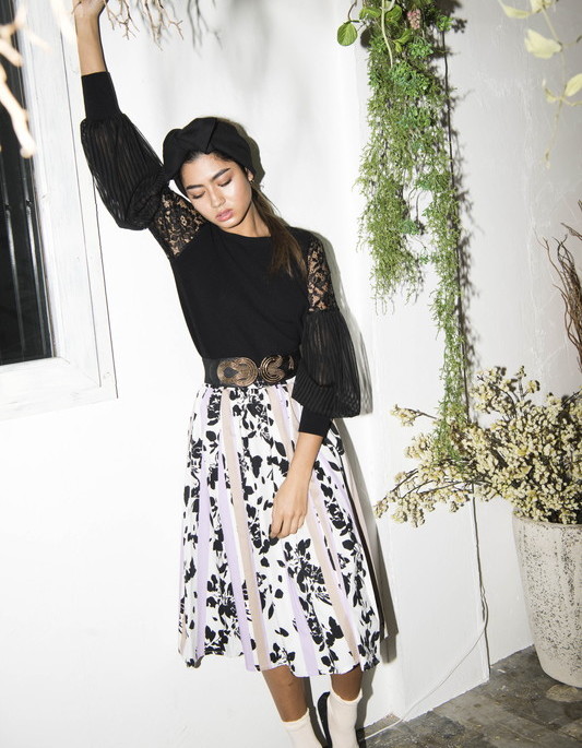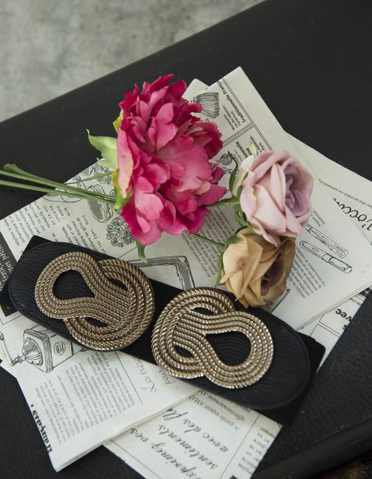 インパクトのあるバックルがビンテージライクでコーディネートをスタイルアップしてくれるゴムベルトです。ブラウス×スカートの2ピースコーデ、ワンピースのワンポイントにおすすめ☆