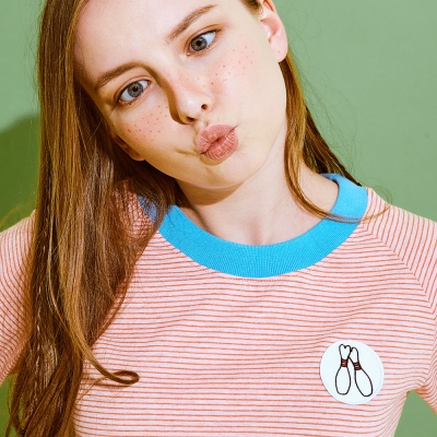 하트볼링핀 패치가 부착된 나그랑 티셔츠.