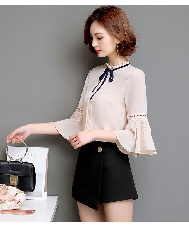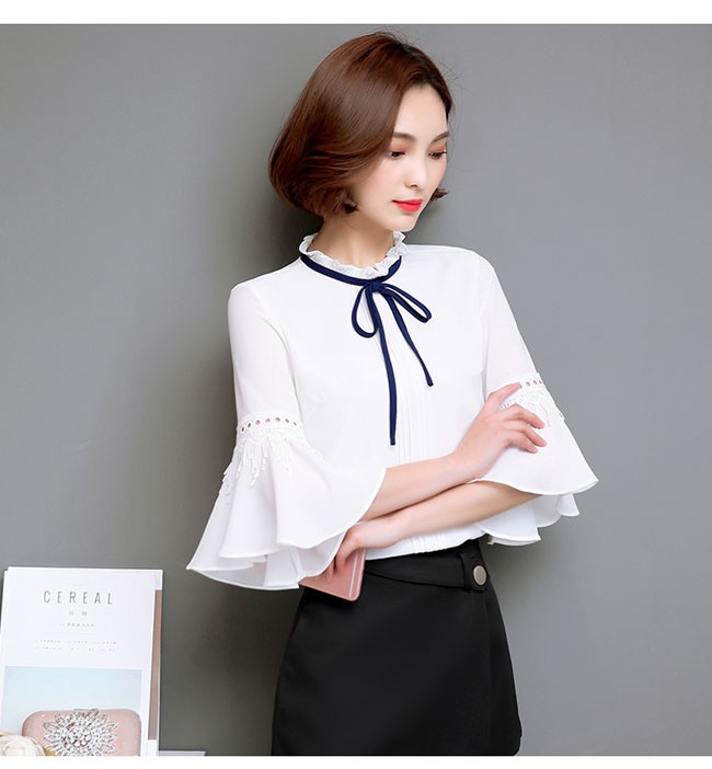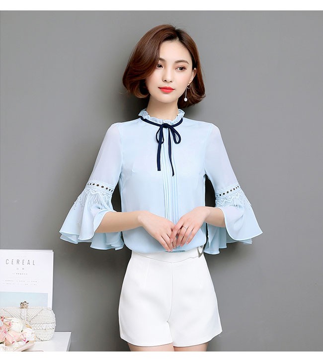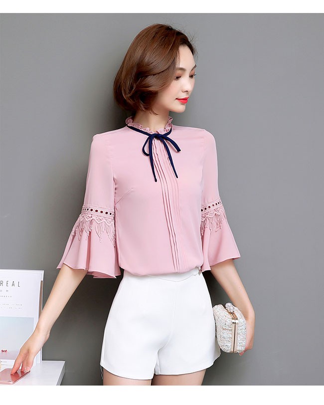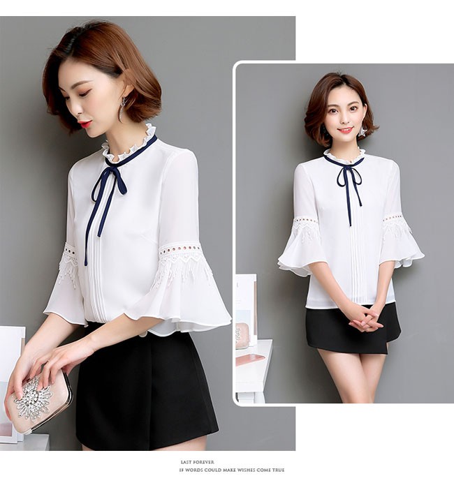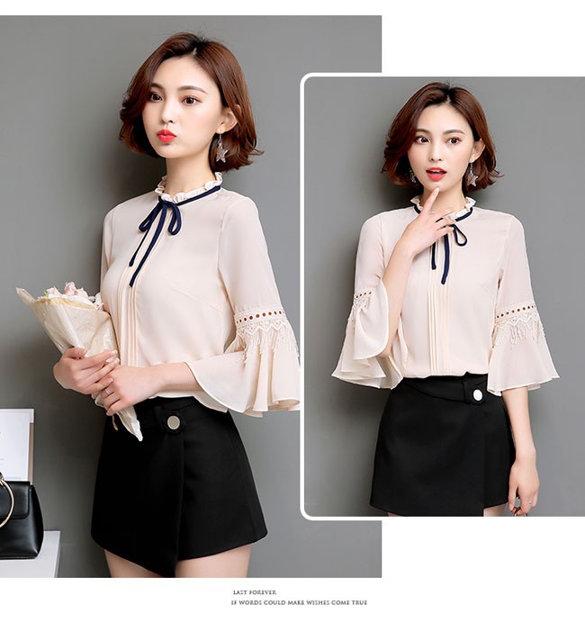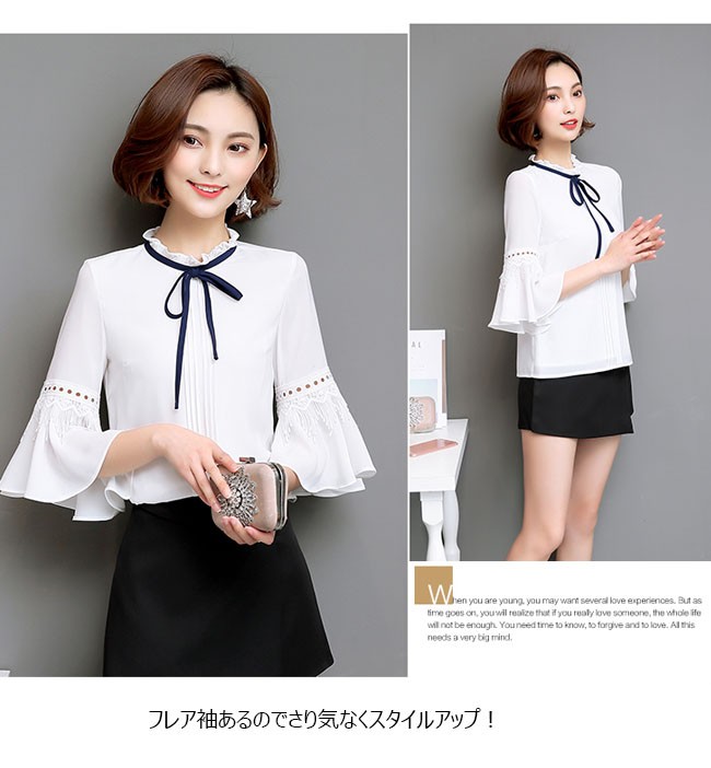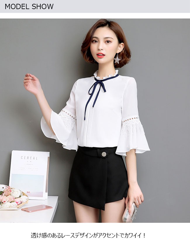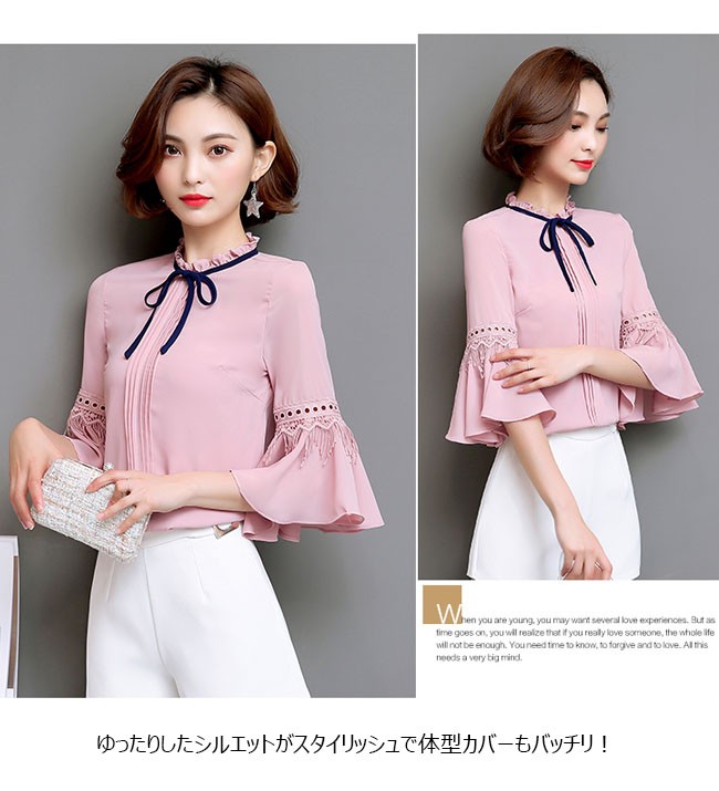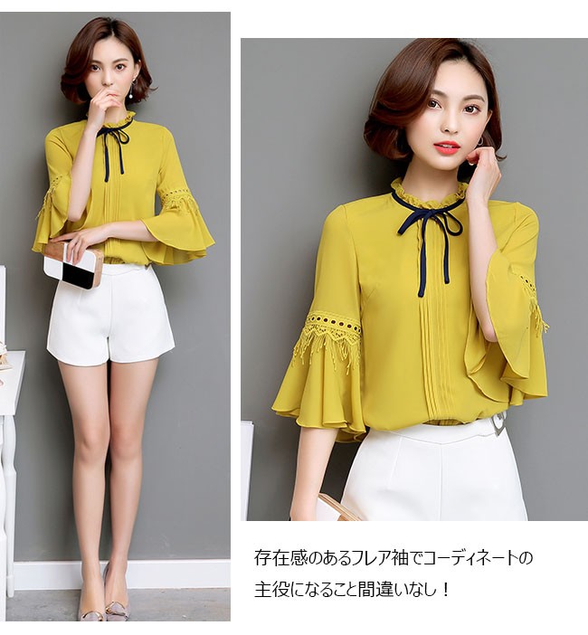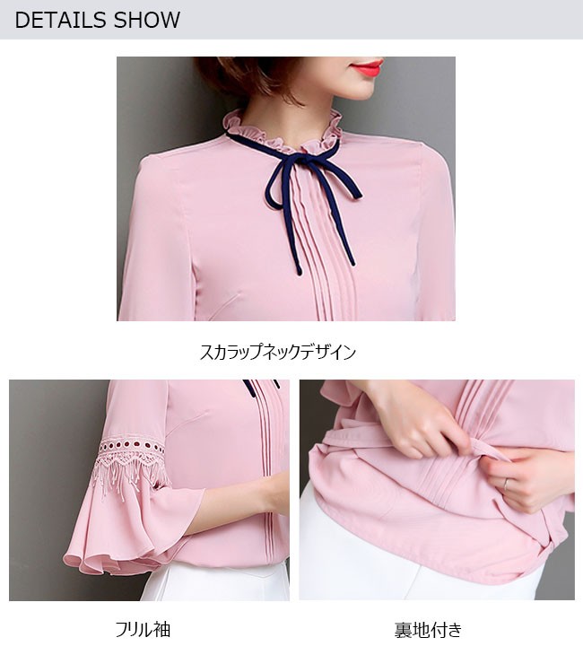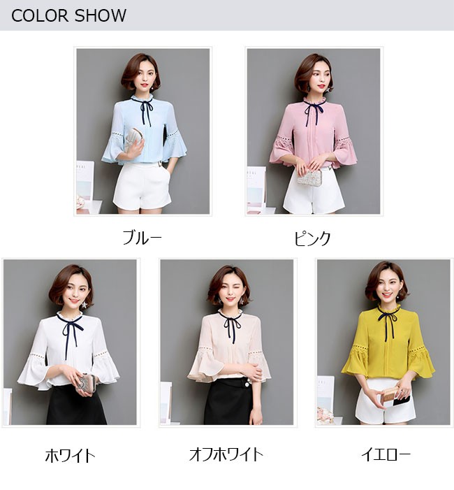 | 商品名 | シフォンシャツ シフォンブラウス トップス レディース ラウンドネック フリル袖 七分袖 リボン付き スイート カワイイ 通勤 お呼ばれ 秋新作 |
