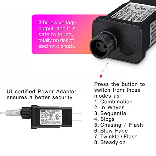 - 8 Lighting Modes: Available in 8 modes as Combination, In Waves, Sequential, Slo-glo, Chasing / flash, Slow Fade, Twinkle / Flash, Steady on, Just perss the button on the adapter to benefit from those amazing lighting modes one by one
