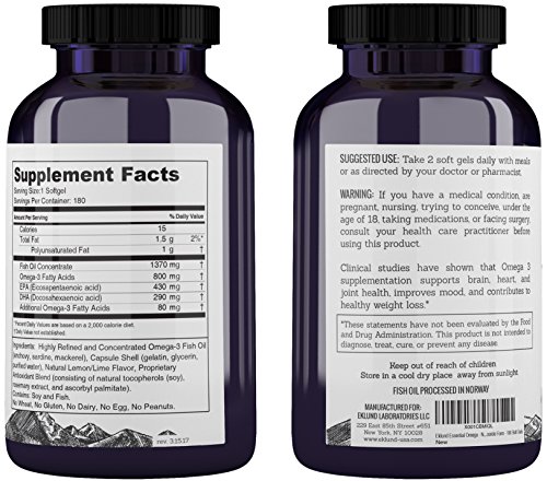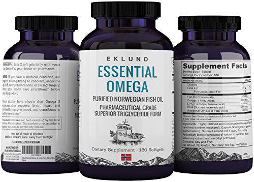 High concentration means fewer pills per day. Each capsule of Eklund Essential Omega contains 800 mg. of Omega 3 Fatty Acids, including 430 mg. of EPA and 290 mg. of DHA, which means more Omega 3 benefits with fewer pills.