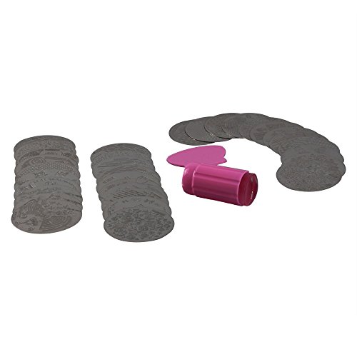 Feature : Includes 30 unique plates with 6 to 10 designs on each plate / Remove protective blue film from stainless steel plates before use / Includes stamper and scraper- ready to use / Easy to follow directions on package / Plates measure 3 inches