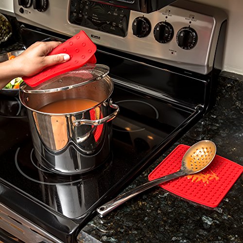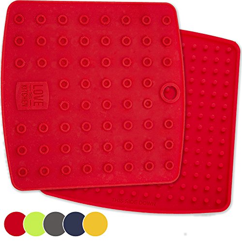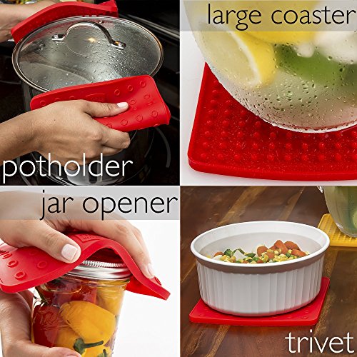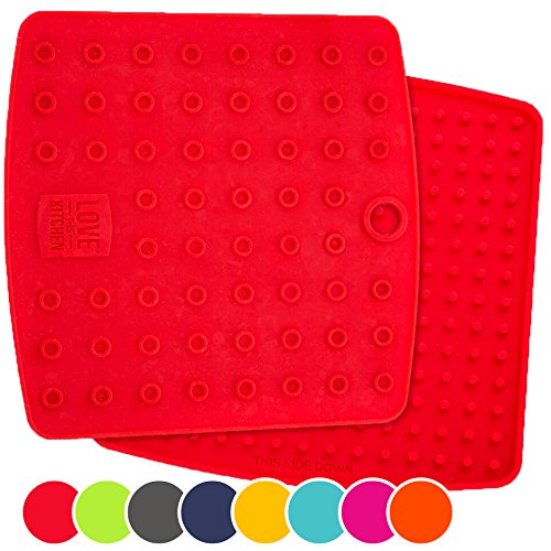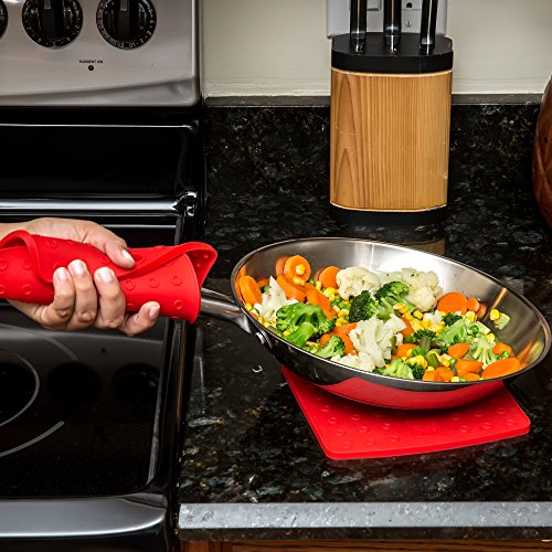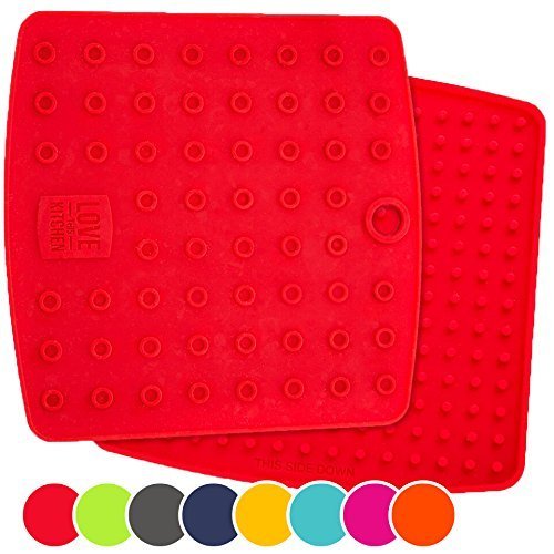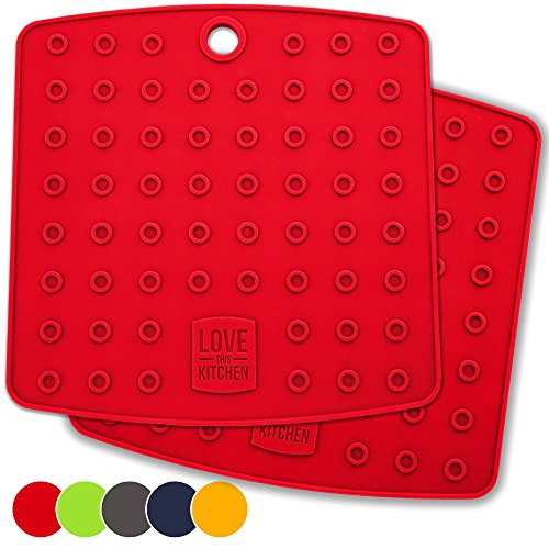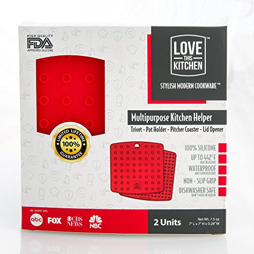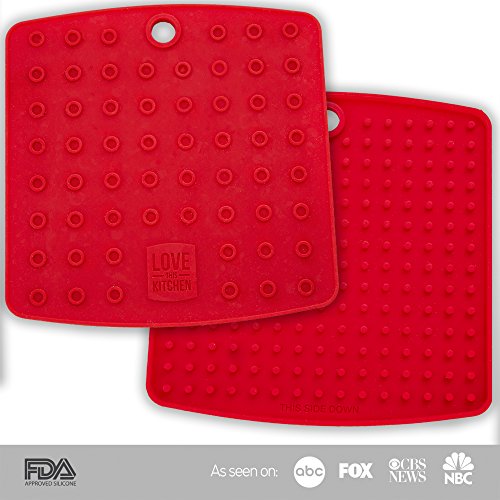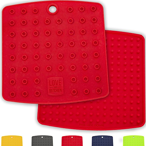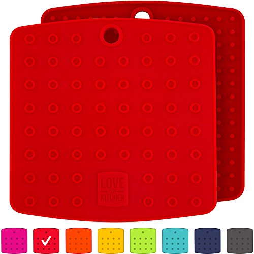 - FDA food-grade silicone is extra-flexible thick (.28") - Dishwasher-safe - Won't mold, mildew, crack or absorb odors - Heat-resistant up to 442°F - Includes set of 2 trivets - Dimensions: 7" x 7" x 0.28" - Excellent gift idea for Mother's day, birthdays, housewarmings, bridal showers, etc!