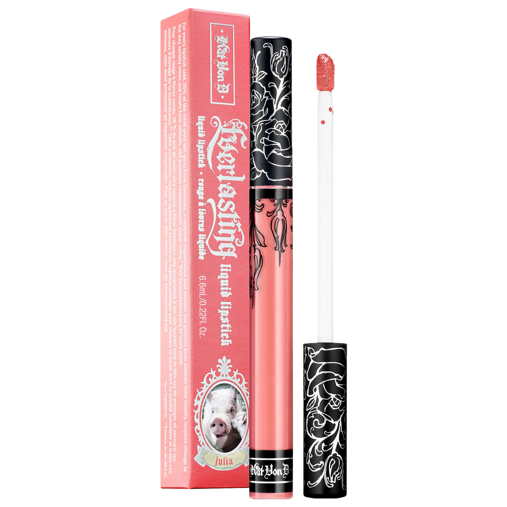 Kat Von D created these four super-special lipsticks to benefit a cause that is extremely close to her heartanimal advocacy and compassionate vegan living. As a devoted volunteer and supporter, Kat has partnered with Farm Sanctuary, a nonprofit organization that rescues, rehabilitates, and provides refuge for factory farm animals. For every lipstick in this collection sold, 20 percent of the retail price will go directly to Farm Sanctuary to support their mission.