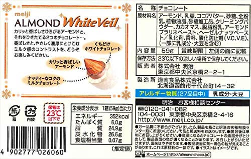 原材料:アーモンド、乳糖、ココアバター、砂糖、全粉乳、植物油脂、砂糖加工品、クリーミングパウダー、カカオマス、脱脂粉乳、アーモンドプラリネペースト、ヘーゼルナッツペースト、乳化剤、香料、酸化防止剤(V.C、V.E)、(一部に乳成分・大豆を含む)