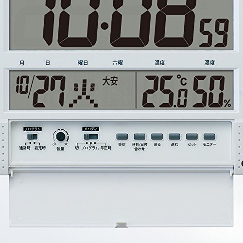 -. Feature : 本体サイズ:18.6×26.4×3.9cm 置いた状態:18.0×26.4×8.1cm / 本体重量:0.7kg / 素材・材質:プラスチック枠(白パール塗装)、前面ガラス / 原産国:中国 / ムーブメント:電波修正機能(40kHz/60kHz自動選局)/電波OFFつき / 付属品:電池(単3アルカリ電池×6)、石膏ボード用金具 / チャイム&メロディ、正時・プログラム・オフ切替式、32チャンネルプログラム、フルオートカレンダー / 温湿度表示(温度測定範囲:0℃~40℃ 測定精度±2℃、湿度測定範囲:25%RH~85%RH 測定精度±8%(25℃))、高コントラスト液晶、六曜表示 / 報時モニター、電池切れ予告、音量調整、自動鳴止め、石膏ボード用金具付