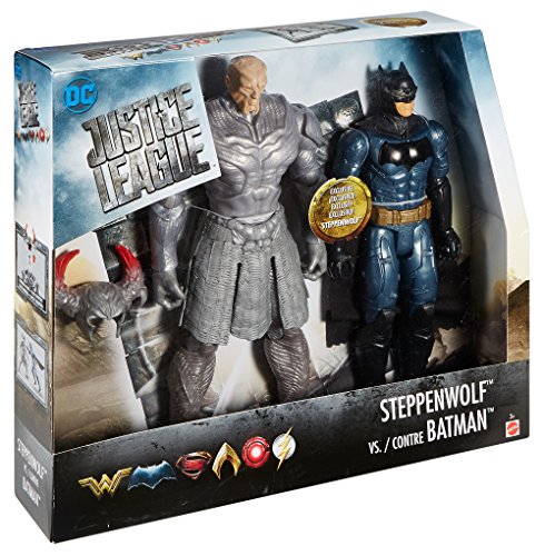 -. Binding : Toy -. Brand : Mattel -. EAN : 0887961504668 -. Feature : 12" Batman and 14" Steppenwolf action figures from the new Justice League movie / Complete hero/villain play in a box / 13" scale oversized Steppenwolf figure is its only offering in this size / Steppenwolf includes removable helmet / Exclusive Batman figure wears tactical gear and cloth cape -. IsAdultProduct : 0 -. Label : Mattel -. Manufacturer : Mattel -. Model : FGG85 -. MPN : FGG85 -. NumberOfItems : 1 -. PackageQuantity : 1 -. PartNumber : FGG85 -. ProductGroup : Toy -. ProductTypeName : TOYS_AND_GAMES -. Publisher : Mattel -. ReleaseDate : 2017-10-15 -. Studio : Mattel -. Title : DC Justice League Batman vs Steppenwolf Figures, 12" (2-Pack) -. UPC : 887961504668 -. Warranty : 1 year warranty against manufacturer defects