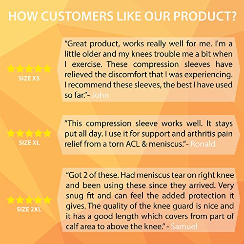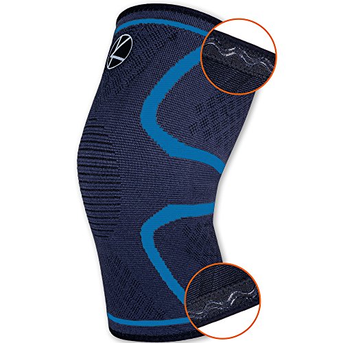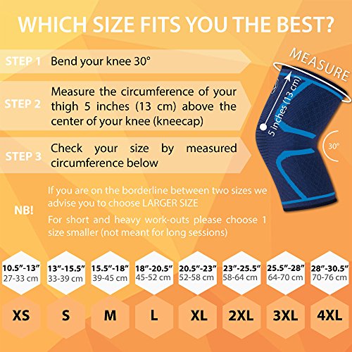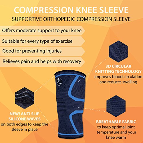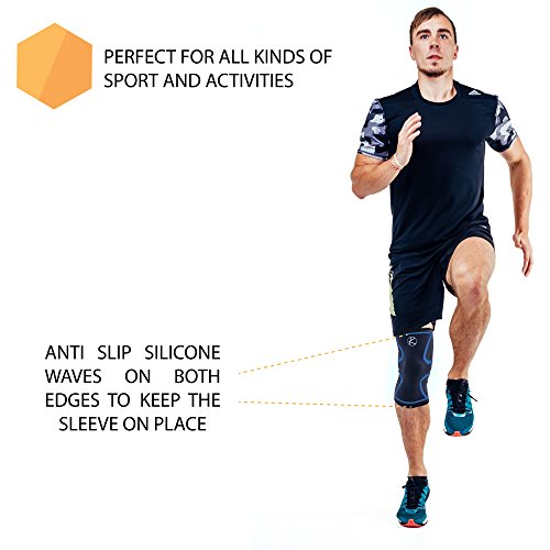 - ✔ ANTI-SLIP TECHNOLOGY: We promise - your knee sleeve will never fall down while exercising again! Thanks to the double anti-slip silicone strips on the top of the sleeve, you’ll never experience the undesirable slippery effect again! Full support and protection is guaranteed throughout your whole workout process - knee brace for running, basketball, crossfit & other!