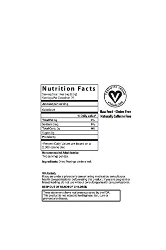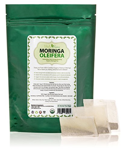-. Binding : Health and Beauty -. Brand : Vitalize Source -. EAN : 7252885641271 -. Feature : 100% Pure and Natural CAFFEINE FREE, GMO FREE, GLUTEN FREE,VEGAN. No Artificial ingredients added can be enjoyed by all the family. Drink it plain or spice it up with lemon, cinnamon, or honey. / RESEALABLE PACK to keep fresh your Natural Organic Moringa Oleifera Tea Drink HOT OR COLD: Great for a morning pick me up or an evening relaxation aid. Increases the Natural Defenses of the Body. Provides nourishment and helps energize all day, helps keep you focused, mental clarity. / USDA Certified Organic, FDA Registered Facility, Organically Grown, Harvested and Manufactured by ISO Standard Certified Moringa Company. / Moringa Leaves Contain over 90 plant-based vitamins and minerals Helps to boost and sustain energy levels Supports weight loss through improved metabolism and digestion / LOVE IT OR YOUR MONEY BACK - We are all about customer satisfaction - if for any reason you aren't satisfied, we offer a FULL MONEY-BACK GUARANTEE. We love our products and know you will too.. -. IsAdultProduct : 0 -. Label : Vitalize Source -. Manufacturer : Vitalize Source -. PackageQuantity : 30 -. ProductGroup : Health and Beauty -. ProductTypeName : HEALTH_PERSONAL_CARE -. Publisher : Vitalize Source -. Studio : Vitalize Source -. Title : Organic Moringa Tea Bags 30 All Natural 100% Certified Pure Raw Dried Leaf - Highly Nutritious Energizer and Refresher - Caffeine Free - Love it or your Money back