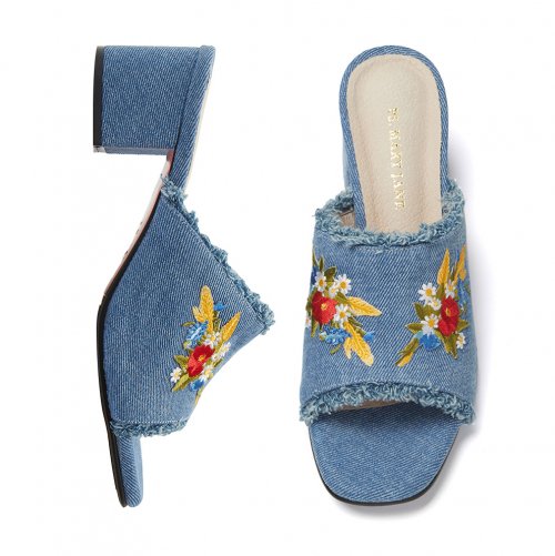 빈티지한 느낌을 주는 청지원단과 플라워 자수를 사용한 뮬.