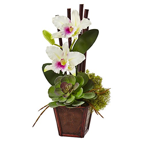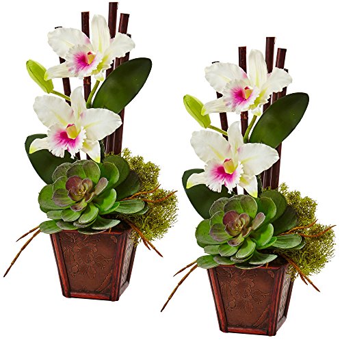 Nearly Natural 1445-S2-WH Cattleya Orchid & Succulent Arrangement (Set of 2)
