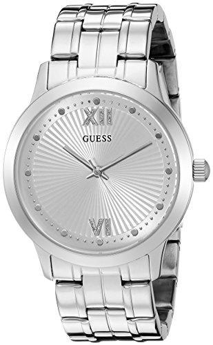 Guess U0634L1 Iconic Signature women's watch features a 38mm wide and 9mm thick solid stainless steel case with a fixed bezel and textured push-pull crown. Guess U0634L1 is powered by a Japanese quartz movement. This beautiful watch also features a textured shiny silver tone dial with silver tone luminous hands and dot hour markers, scratch resistant mineral crystal and water resistant to 30 meters. Guess U0634L1 is equipped with a 20mm wide solid stainless steel bracelet with a fold over push button clasp. Guess U0634L1 women's Iconic Signature silver dial stainless steel bracelet watch is brand new and comes in an original Guess gift box and is backed by a 2 year store limited warranty.Feature