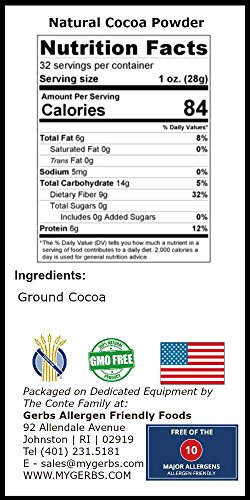 Gerbs Allergen Free Cocoa Powder. Our organic natural unsweetened cocoa powder offers a deep chocolate flavor to baked goods. Its intense flavor makes it a perfect ingredient match for brownies, cookies and some chocolate cakes. Product of Barry Callebaut - Packaged by GERBS.