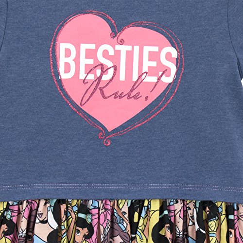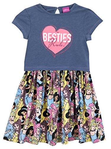 Girls Disney Princess Dress. Add some Disney Style to their everyday wear with this adorable piece inspired by the fashionable Disney Princess'. This cute dress comes with a short sleeved top with the slogan 'Besties Rule!' in a pink heart, and has keyhole back fastening. Featuring a colourful pattern of Princess' Ariel, Cinderella, Belle and Jasmine on the skirt, this dress is a must in their royal wardrobes!