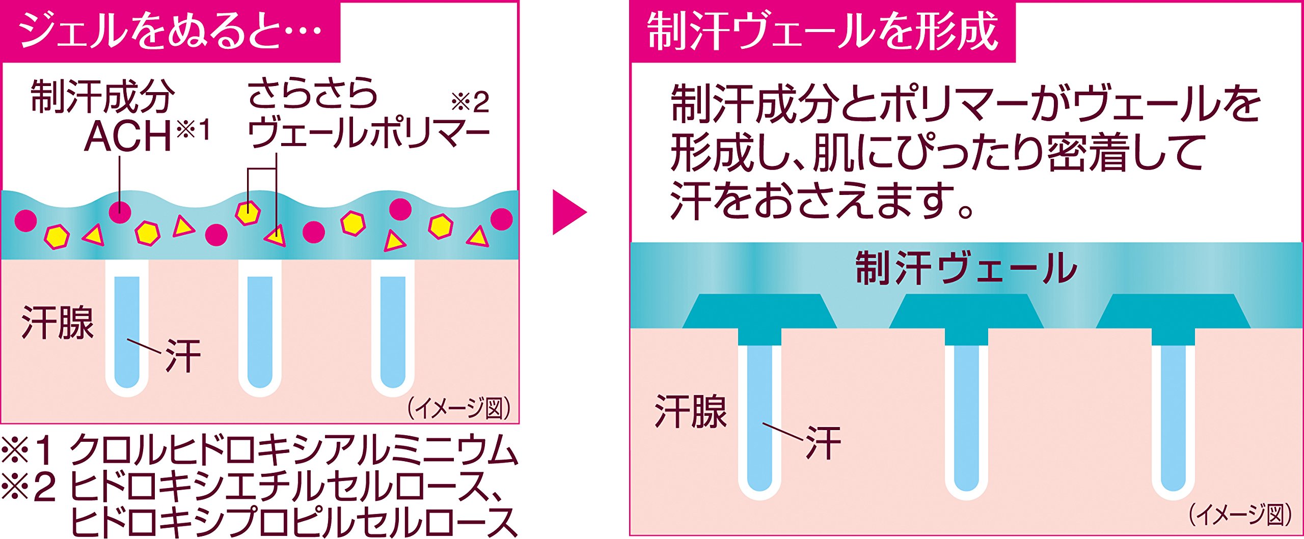 ● Antiperspirant ingredient ACH and polymer form veil, it closely adheres to the skin and keeps sweat.